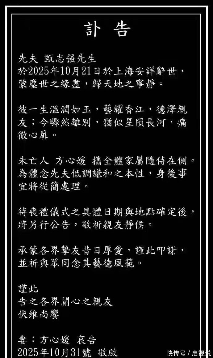 10月31日,他的妻子方心媛正式发布讣告,透露甄志强已于10月21日在上海离世。消息一经传出,整个港圈为之震惊,无数老影迷难以置信。